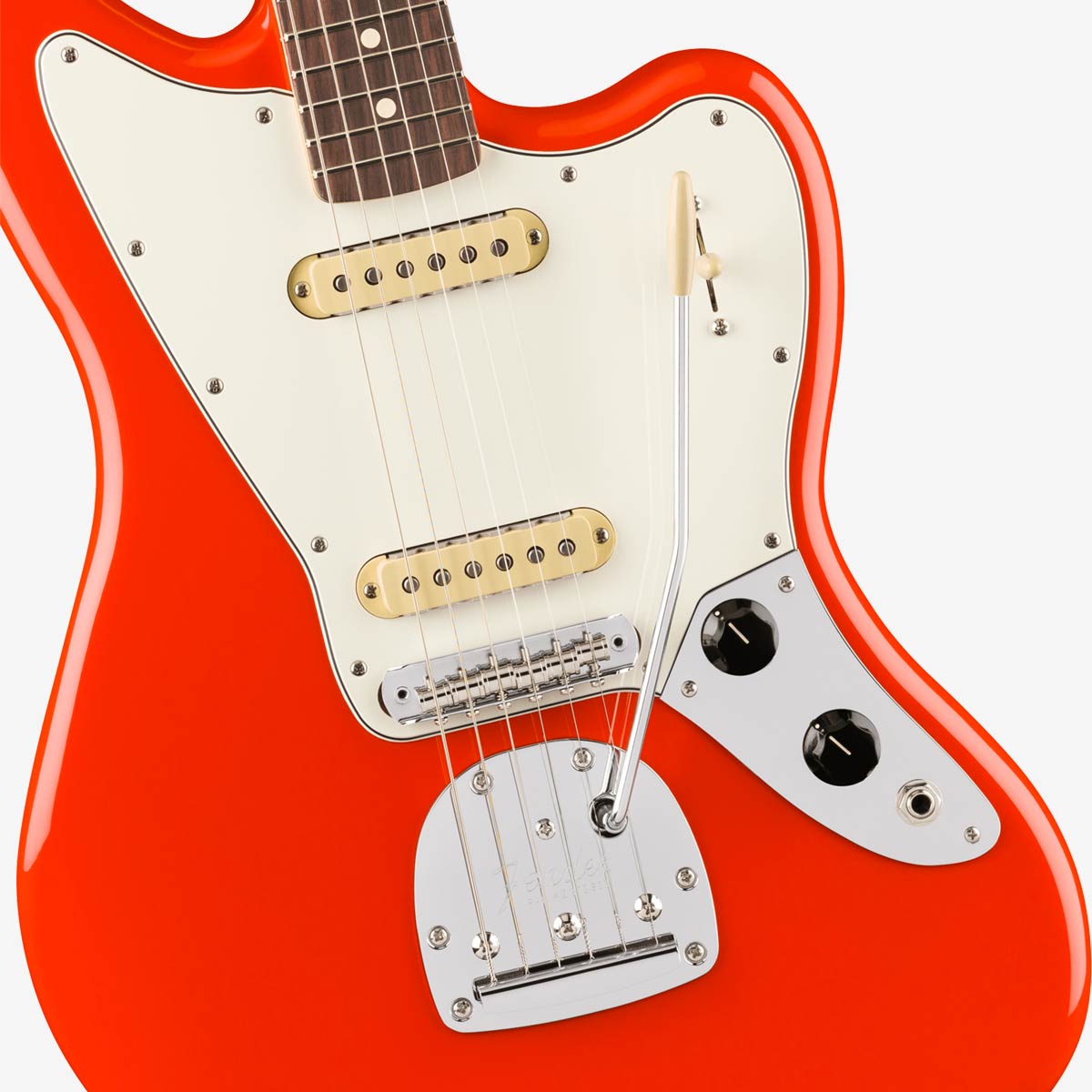 Fender Player II Jaguar Electic Guitar Coral Red Step into the spotlight with the Fender Player II Jaguar, a stage-ready guitar that blends iconic Fender sound with contemporary updates. This guitar features a contoured alder body and a modern "C" neck profile with a silky satin urethane finish, ensuring fast and fluid playability. The 9.5" radius rosewood fingerboard with rolled edges and 22 medium jumbo frets provide smooth playability. Equipped with Player Series Alnico V (Bridge) and Alnico II (Neck) single-coil Jaguar pickups, it delivers a wide range of tonal options. The Jaguar bridge with Mustang saddles and vintage-style floating tremolo tailpiece ensures precise tuning stability. ClassicGear™ tuning machines offer reliable performance, making this guitar perfect for crafting your own sound.
