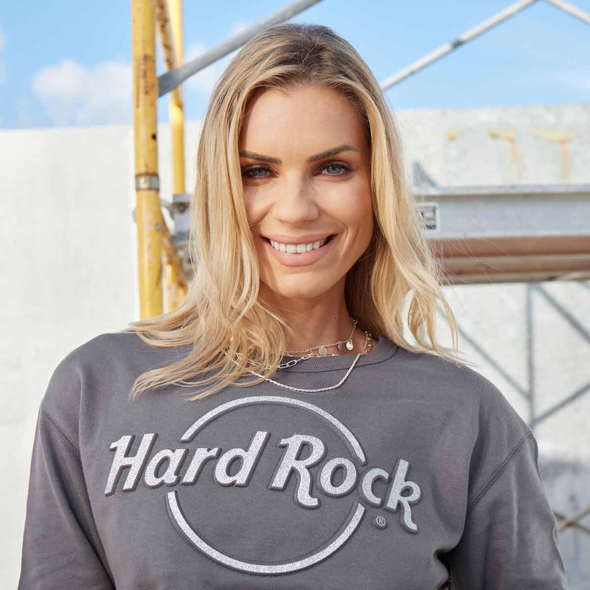 Glitter Logo French Terry Longsleeve Tee Nothing but love for this perfectly lined Hard Rock pullover longsleeve crewneck sweatshirt. Featuring a metallic Hard Rock logo that is 3D raised with silver glitter across the chest makes it spicy and elevated. Plus, it is french-terry lined for added warmth. Dress it up with suede leggings or your favorite pair of vintage jeans.