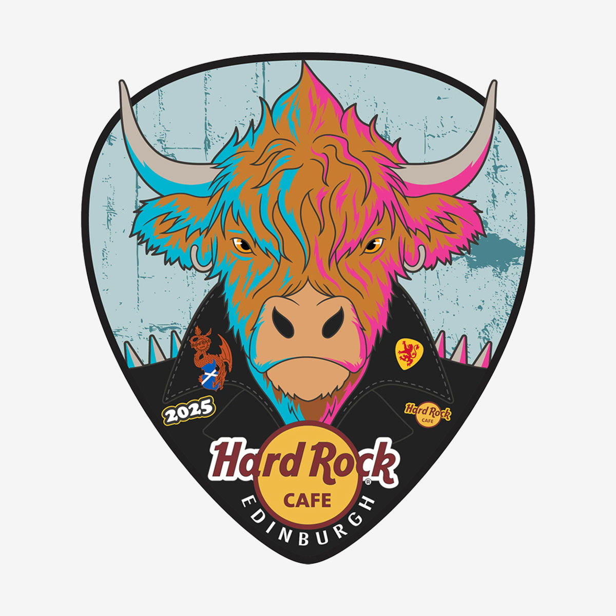 Unleash your inner rebel with the Limited Edition Highland Punk Pin from Hard Rock Cafe Edinburgh! Featuring a bold Highland cow in a leather jacket, this pick-shaped collectible combines traditional Scottish pride with Hard Rock’s style.