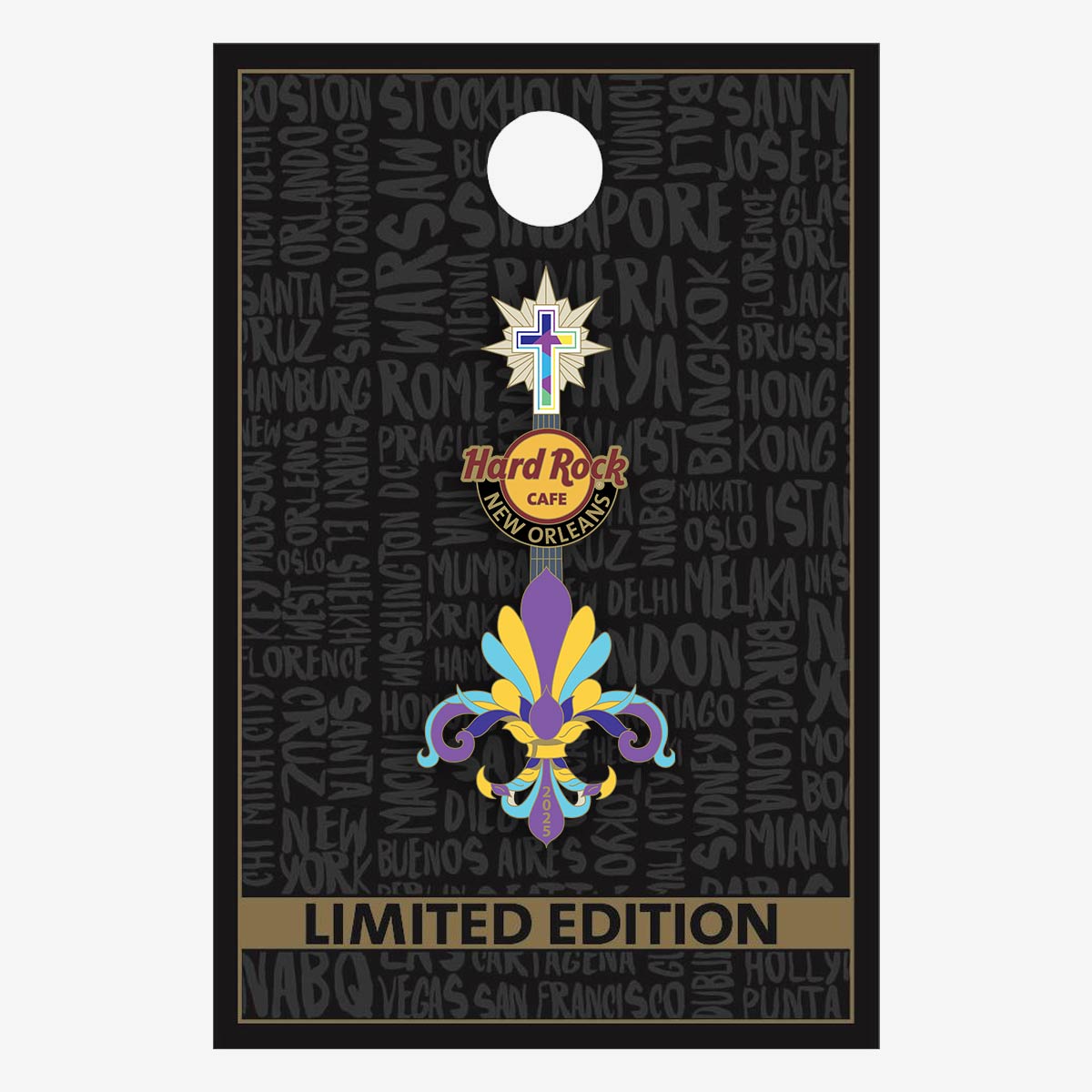 Hard Rock New Orleans Cross Fleur Guitar Limited Edition Pin brings together the thrill of gaming and the rich heritage of New Orleans in a bold, highly detailed design. A four-of-a-kind poker hand fans out behind sculpted dice, while swirling chips form a “100” that speaks to the high-stakes energy of the Crescent City. The guitar silhouette at the center grounds the design, crowned by a fleur-de-lis that highlights the city’s deep cultural roots. Finished in antique silver, this collectible pin captures the pulse of New Orleans nightlife with refined depth and dimensional detail. Whether you’re drawn to the city’s legendary music scene, its casino glamour, or its unmistakable flair, this Limited Edition pin delivers a collectible piece with real presence. Perfect for fans of themed enamel pins, destination collectibles, and music-inspired memorabilia that celebrate local icons and unmistakable style.