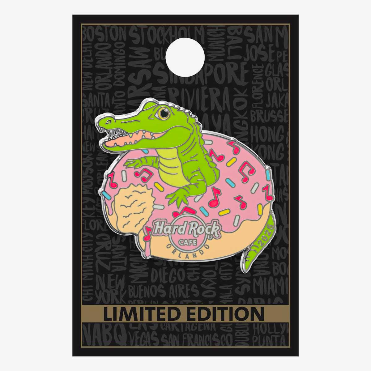 Dive into the fun with the Limited Edition Gator Bites Pin! This colorful design highlights a green alligator resting in a pink-frosted donut sprinkled with music notes, bringing Orlando’s lively energy to your collection.