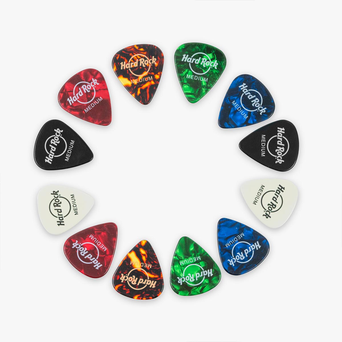 Set of 12 Hard Rock Logo Guitar Picks Play in style with this colorful and vibrant assortment of premium Hard Rock guitar picks. Great playing accessory to have on hand any time you feel inspired.
