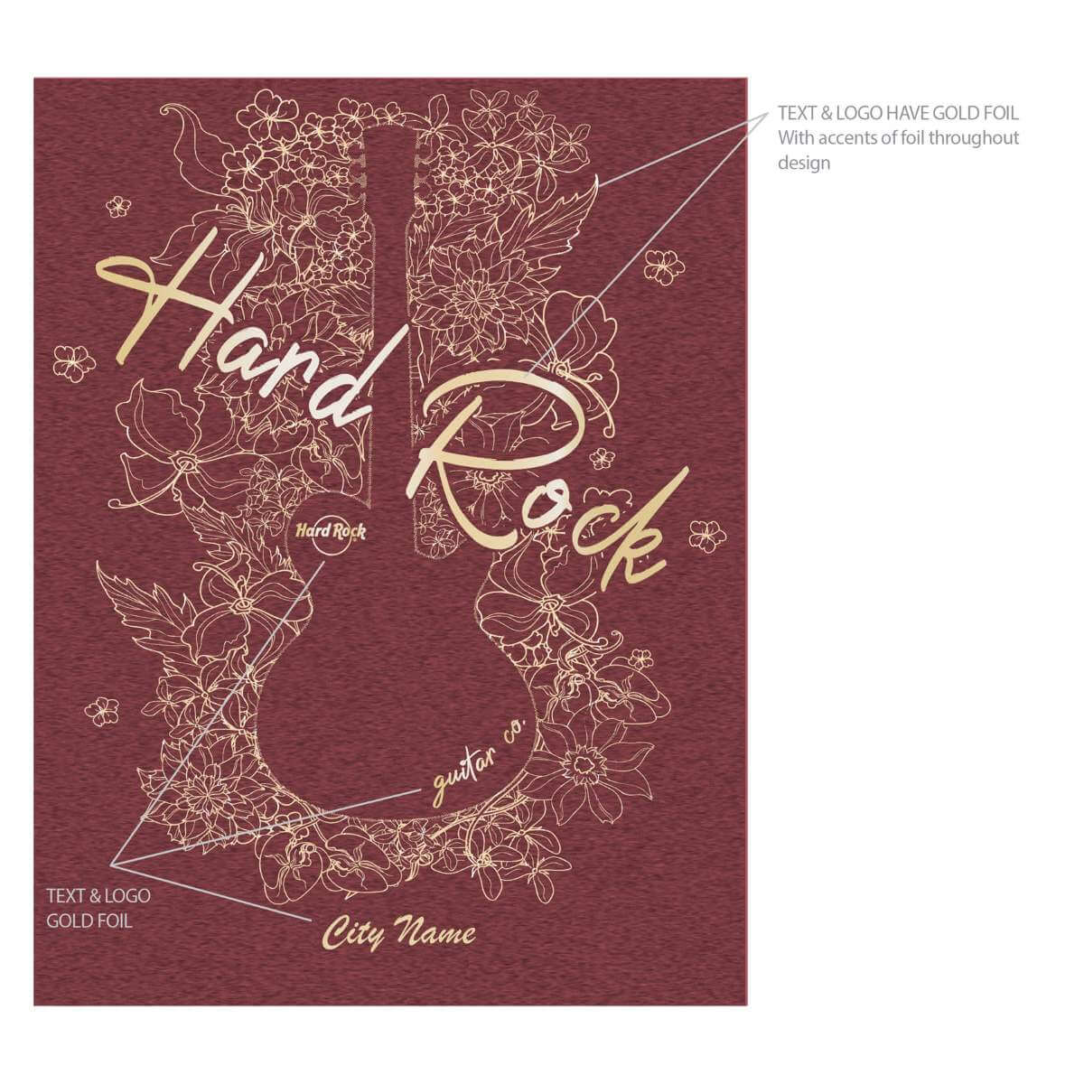 Women’s Foil Guitar Silhouette Side Knot Tee Just in time for warmer weather comes are newest top for women. A guitar silhouette is surrounded by floral gold foil treatments while soft burgundy fabric, cross front neck design and side knot add comfortable stylish touches.