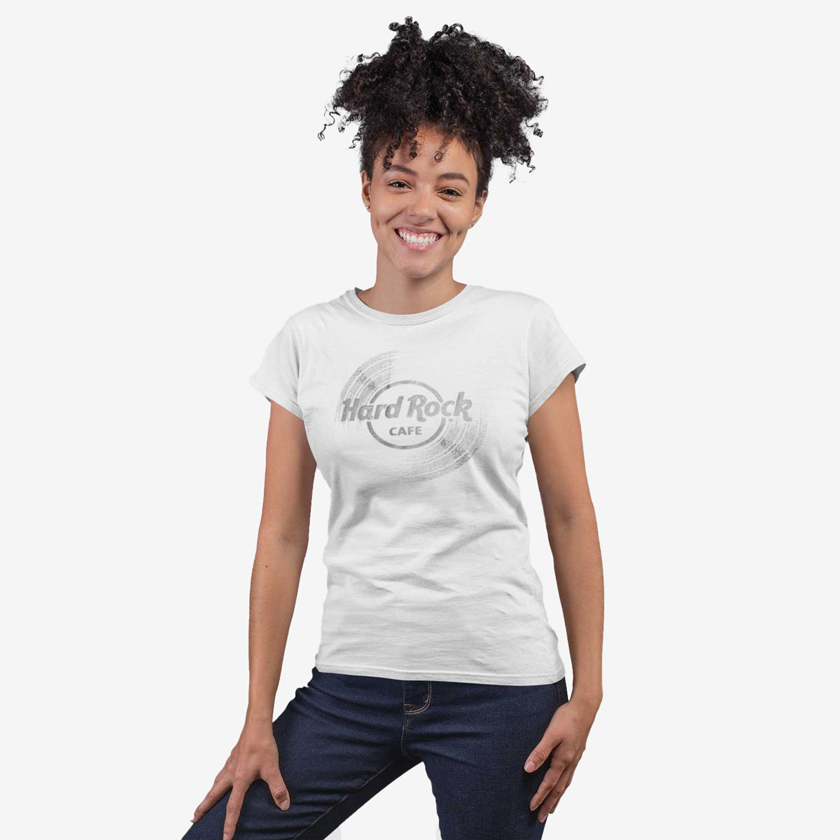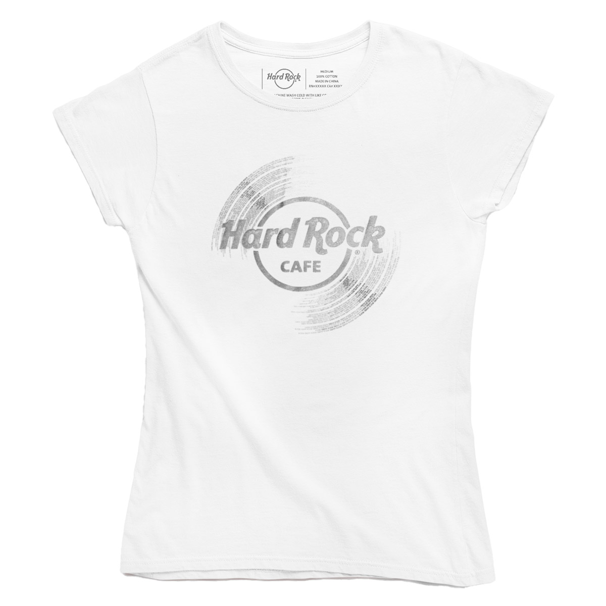 Women’s Vinyl Logo Shortsleeve Crewneck Tee in White Spin right round in our Women’s Fit Hard Rock vinyl logo shortleeve tee. Soft blended fabric, just the right amount of stretch, and a casual fit for every day of the week. Pair it with skinny jeans, and metallic sneakers for an effortless, everyday look!